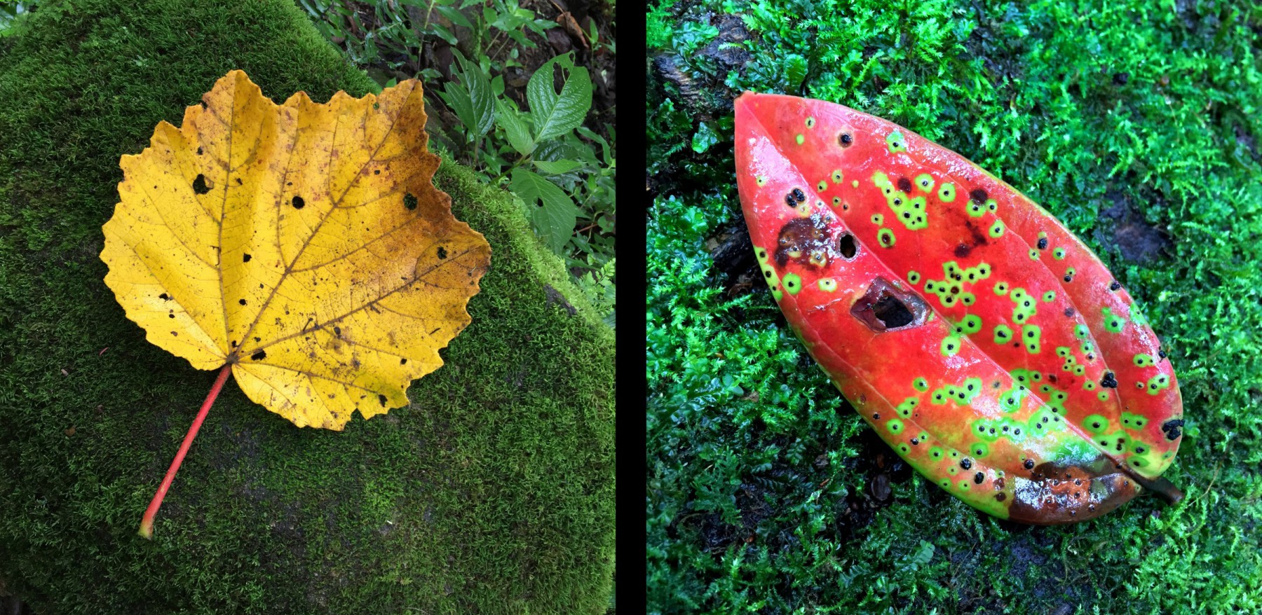 Image of a yellow leaf and a red leaf in the forest floor. Photo by Eduardo Libby