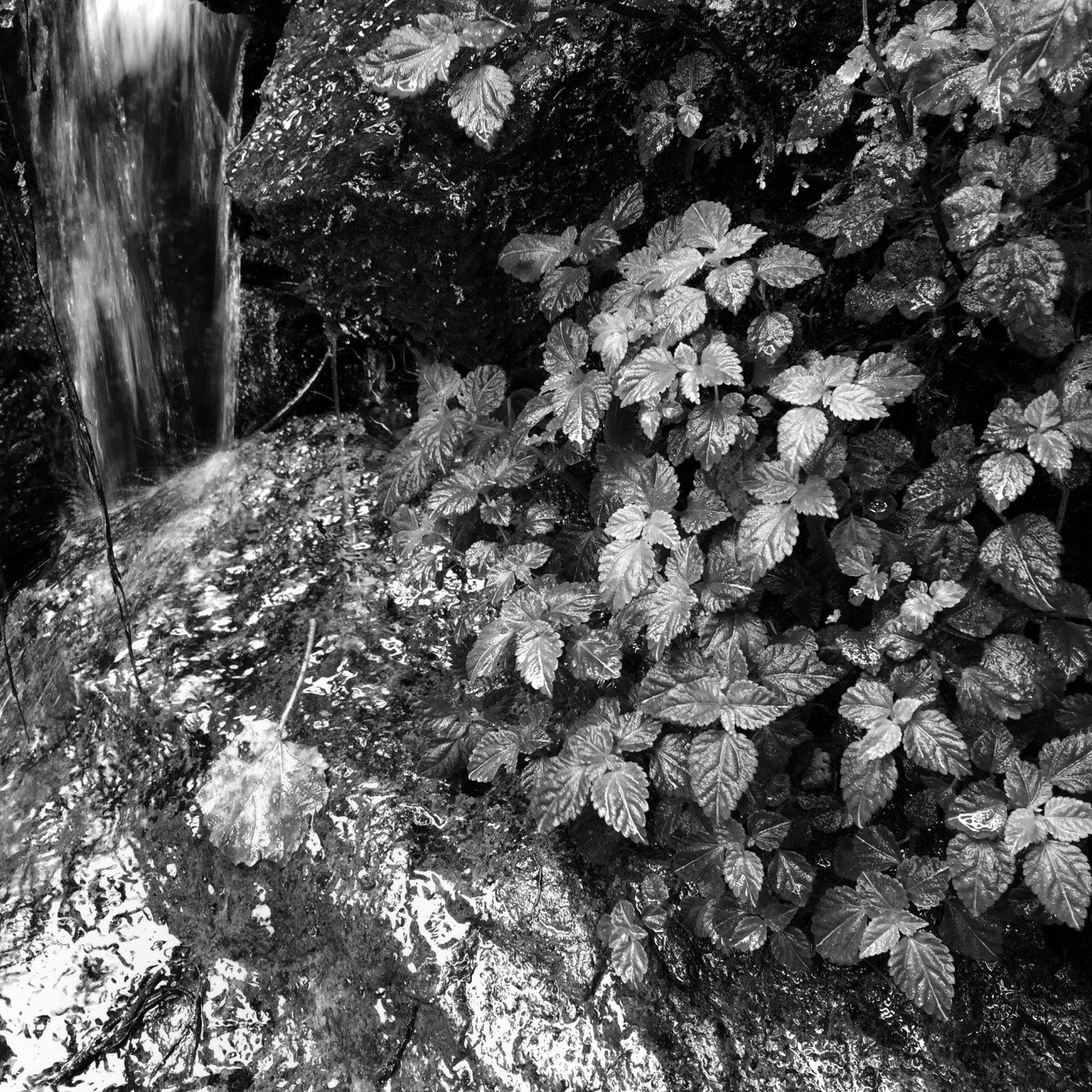 Black and white image of plants growing on a rock by a stream. Photo by Eduardo Libby.
