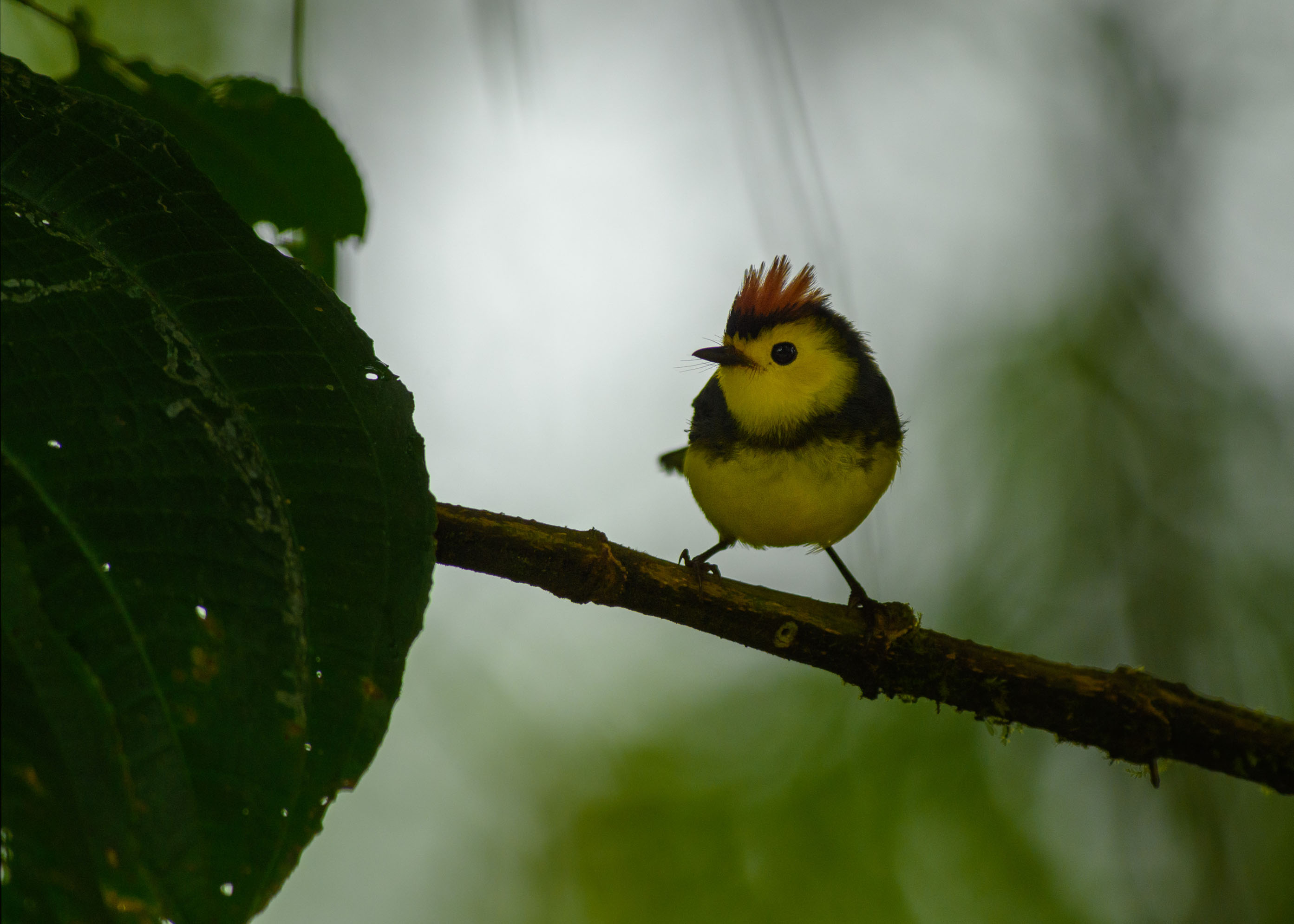 A tiny Costa Rican Warbler (its name actually) foraging on top of an aroid leaf.