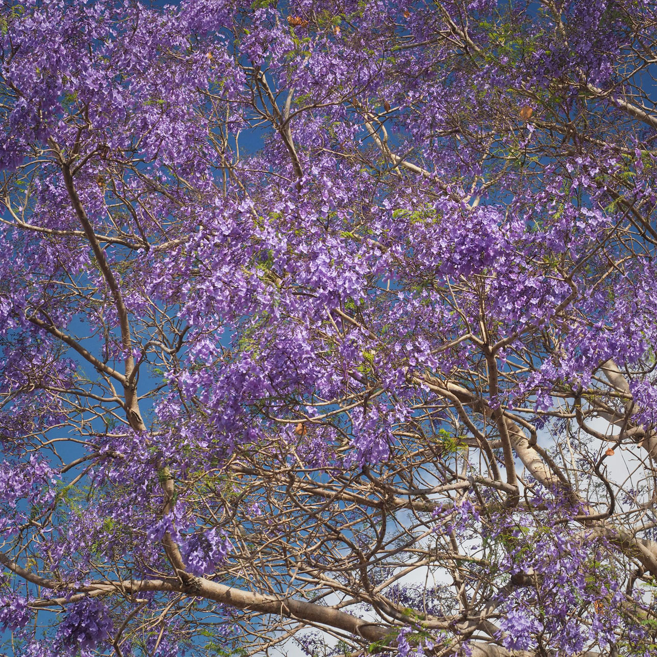 This tree’s photos convinced me of the high quality of lenses for micro four thirds cameras when last year I photographed it and was blown away by the acutance of the images. I photographed it this year using a polarizing filter that helped to bring out the violet flowers against the blue sky.